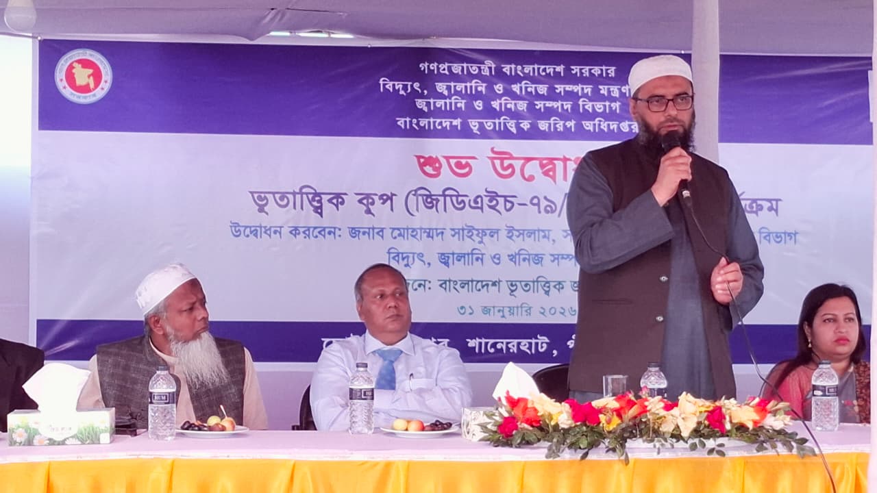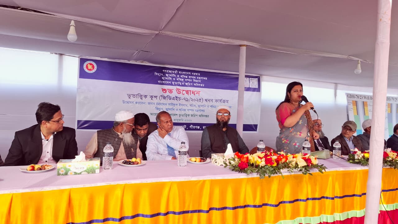 ৩১.০১.২০২৬ তারিখে ছোট পাহাড়পুর, শানেরহাট, পীরগঞ্জ, রংপুর-এ “ভূতাত্ত্বিক কূপ খনন কার্যক্রম (জিডিএইচ-৭৯/২০২৫)” এর শুভ উদ্বোধন করেন জ্বালানি ও খনিজ সম্পদ বিভাগের মাননীয় সচিব জনাব মোহাম্মদ সাইফুল ইসলাম। উপস্থিত ছিলেন বাংলাদেশ ভূতাত্ত্বিক জরিপ অধিদপ্তর এর মাননীয় মহাপরিচালক, সংশ্লিষ্ট উপজেলার উপজেলা নির্বাহী কর্মকর্তাসহ অন্যান্য ঊর্ধ্বতন কর্মকর্তাবৃন্দ।